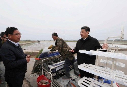 習(xí)近平來到黑龍江省撫遠(yuǎn)市玖成水稻種植專業(yè)合作社,了解合作社土地流轉(zhuǎn)和采用先進(jìn)種植技術(shù)提高水稻產(chǎn)量效益等情況。(圖片來源:新華視點)