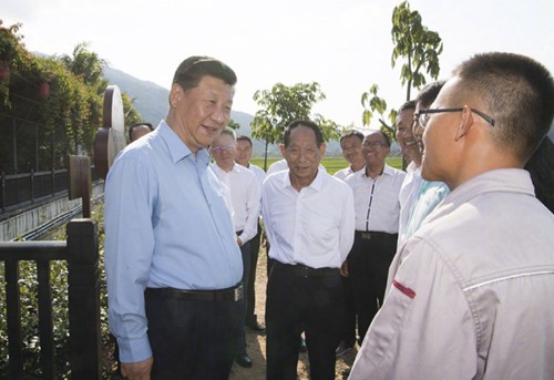 2015年7月16日下午,習(xí)近平來到了光東村。進(jìn)村前,經(jīng)過一大片水稻田時,總書記下車,沿著泥濘的田埂走進(jìn)田里,同正在田間勞作的村民和農(nóng)技人員攀談起來。