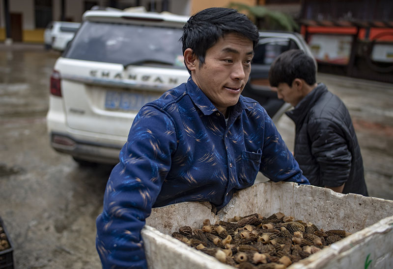 云南貢山縣獨龍江鄉(xiāng)龍元村“致富能手”和曉永在鄉(xiāng)里賣羊肚菌(2019年4月19日攝)。新華社記者 江文耀 攝