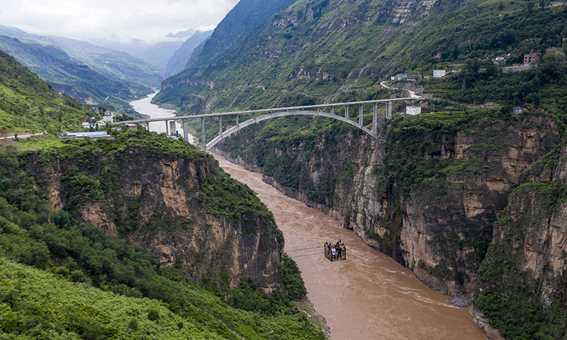 游客們在體驗云南省巧家縣茂租鎮(zhèn)鸚哥村村民蔣世學操作的溜索過江(2020年8月14日攝,無人機照片)。新華社記者 江文耀 攝