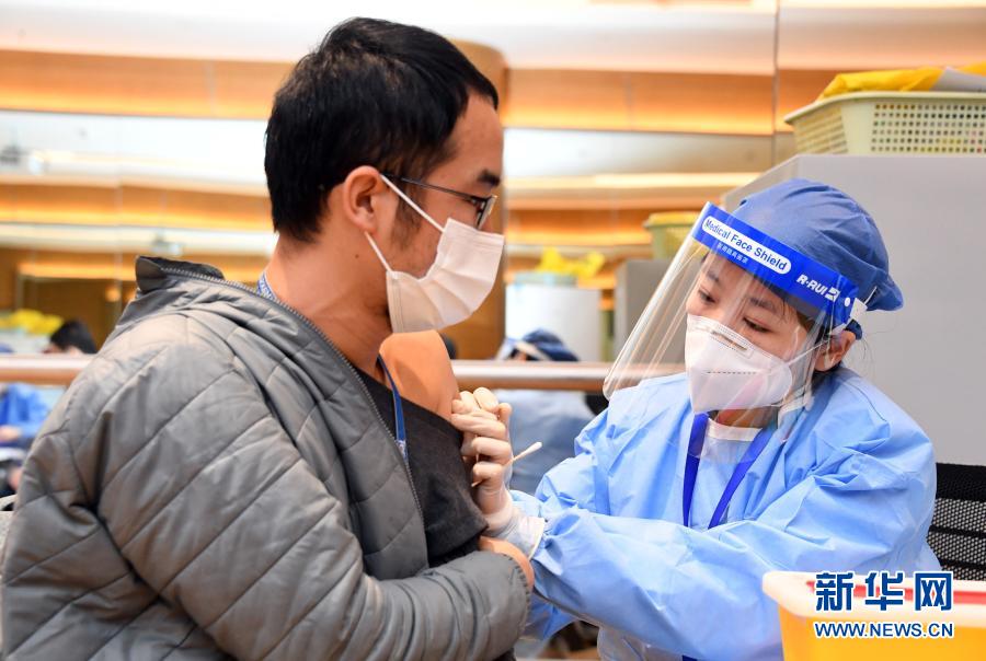2月22日,在北京市海淀區(qū)中關(guān)村軟件園二期一家企業(yè)內(nèi)的臨時(shí)接種點(diǎn),醫(yī)務(wù)人員為企業(yè)員工接種新冠疫苗。新華社記者 任超 攝