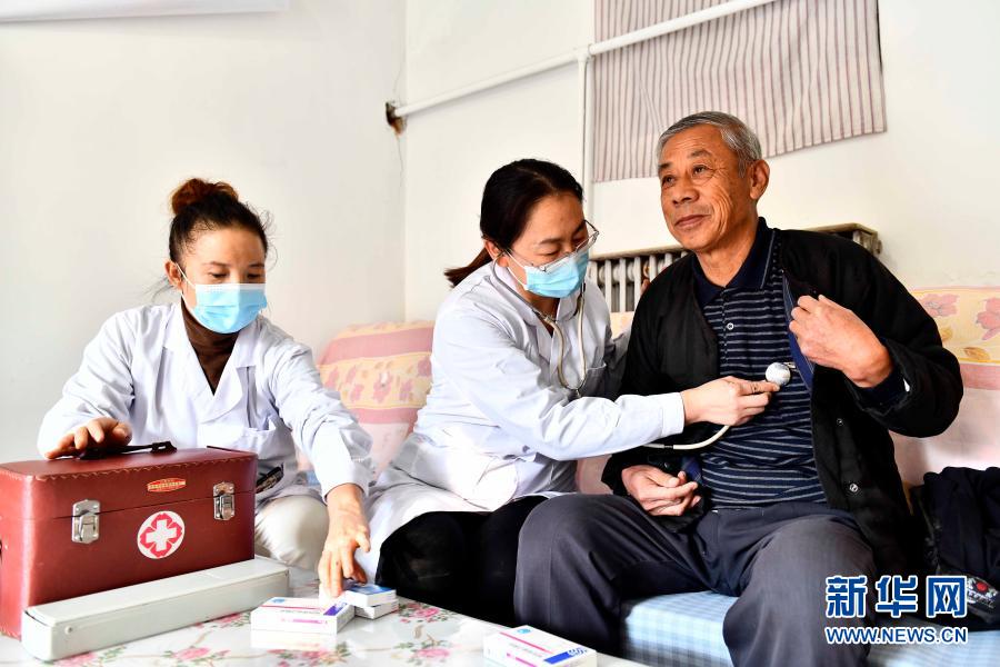 2020年11月11日,在山東省濰坊市寒亭區(qū)寒亭街道東院社區(qū),衛(wèi)生室醫(yī)生王紅霞(中)為村民張勇臣看病。寒亭區(qū)探索實(shí)施醫(yī)保服務(wù)下沉舉措,構(gòu)建起覆蓋全區(qū)基層醫(yī)療機(jī)構(gòu)的醫(yī)保服務(wù)下沉網(wǎng)絡(luò),讓群眾在家門(mén)口便捷地享受醫(yī)保紅利。新華社記者 郭緒雷 攝