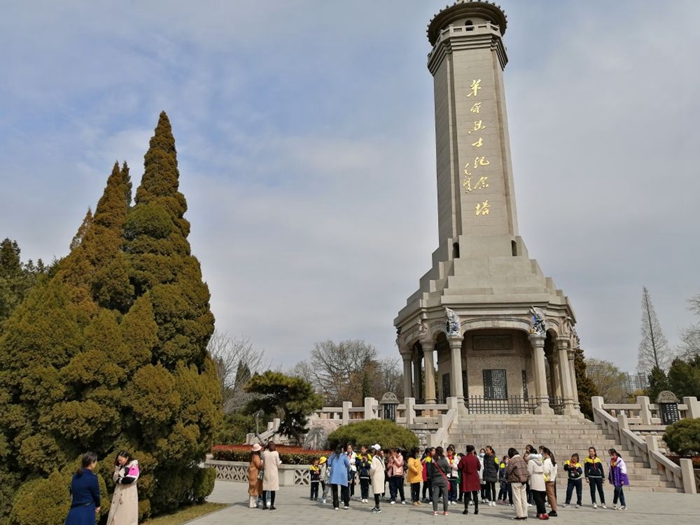 2021年3月18日,小小紅色講解員在位于烈士陵園中央的革命烈士紀念塔前,學生們在學習講解知識的同時也接受紅色教育。新華社記者楊文 攝