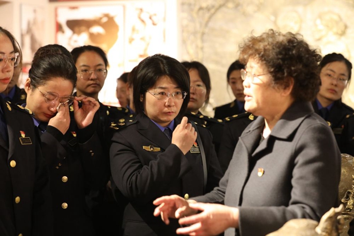 2021年3月5日,山東省臨沂市沂南縣綜合行政執(zhí)法局女黨員聆聽于愛梅(右二)講紅嫂擁軍支前故事,很多黨員被感動流淚。杜昱葆 攝