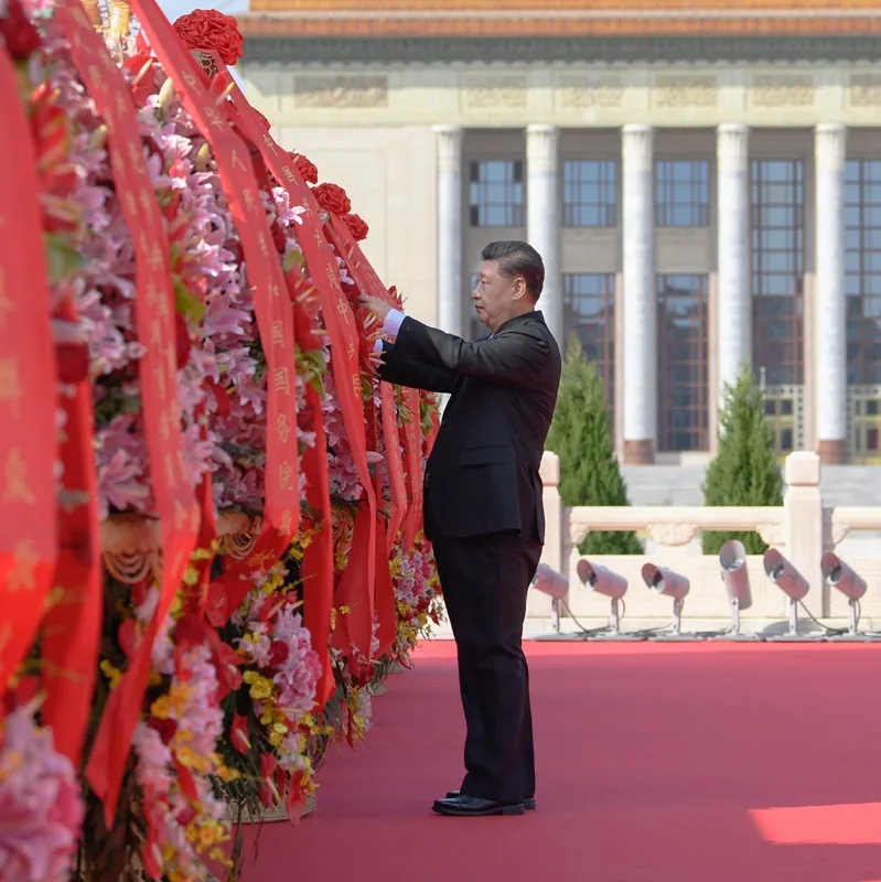 2020年9月30日上午,黨和國(guó)家領(lǐng)導(dǎo)人習(xí)近平、李克強(qiáng)、栗戰(zhàn)書、汪洋、王滬寧、趙樂際、韓正、王岐山等來(lái)到北京天安門廣場(chǎng),出席烈士紀(jì)念日向人民英雄敬獻(xiàn)花籃儀式。這是習(xí)近平整理花籃上的緞帶。新華社記者 申宏 攝