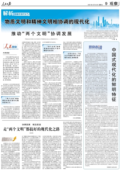 人民日?qǐng)?bào)整版闡釋?zhuān)何镔|(zhì)文明和精神文明相協(xié)調(diào)的現(xiàn)代化