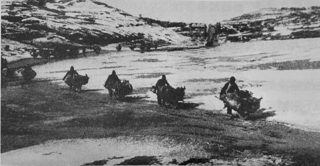 三大戰(zhàn)役期間,解放區(qū)農(nóng)民在冰天雪地中用小車把彈藥、物資運(yùn)往前線。圖片來(lái)源:《中國(guó)共產(chǎn)黨的九十年》