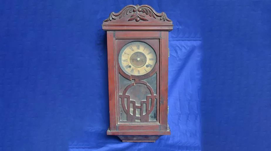 遵義會議的會議室東墻上有個掛鐘,長50厘米、寬22厘米、厚11厘米,是一架自鳴木殼機(jī)械擺鐘,刻度為羅馬數(shù)字,鐘頂飾有變形植物圖案木雕,底部為倒梯形木座,鐘面有玻璃門,門的四周有木質(zhì)雕花邊框。