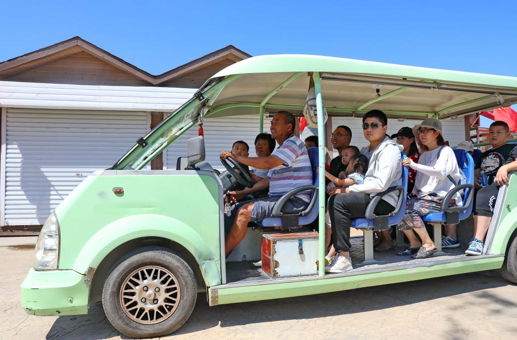 在西柏坡,村民駕駛電動車帶領(lǐng)乘客觀光游覽(2019年8月16日攝)。新華社記者楊世堯攝
