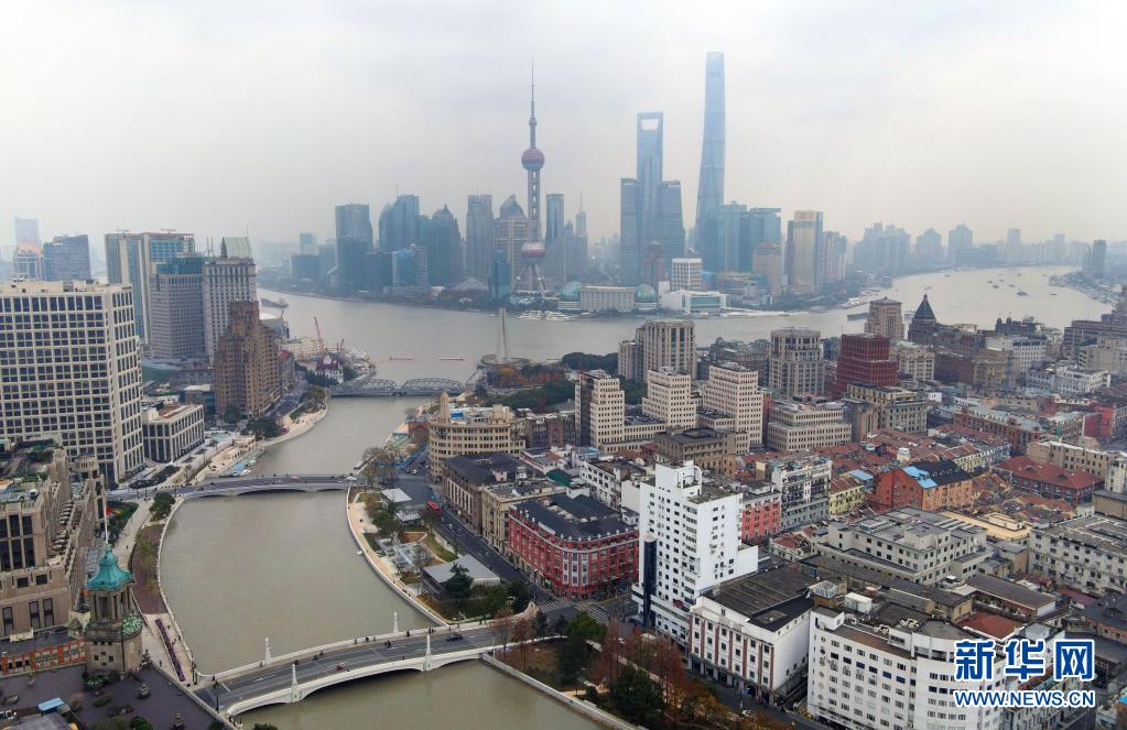 從空中俯瞰蘇州河(下)與黃浦江的交匯處(無人機(jī)照片,2020年12月29日攝)。新華社記者 方喆 攝