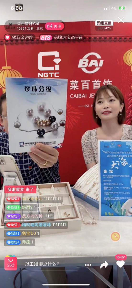 海洋日當(dāng)天珠寶國(guó)檢(NGTC)充分發(fā)揮自身科學(xué)檢測(cè)及教育培訓(xùn)的專業(yè)優(yōu)勢(shì),由珠寶國(guó)檢(NGTC)教育專家——NGTC國(guó)檢珠寶培訓(xùn)中心商學(xué)院副院長(zhǎng)、資深講師張斌與菜百首飾天貓旗艦店、淘寶店的專業(yè)主播一起,通過NGTC+直播間·一直播平臺(tái),菜百首飾天貓旗艦店、菜百首飾淘寶直播間,礦業(yè)界微信公眾號(hào)聯(lián)合直播,為線上觀眾在線介紹珍珠的品質(zhì)分級(jí)原理及方法,解讀珠寶首飾的質(zhì)量保證——珠寶國(guó)檢(NGTC)證書,分享選購(gòu)與保養(yǎng)等科學(xué)消費(fèi)知識(shí)。