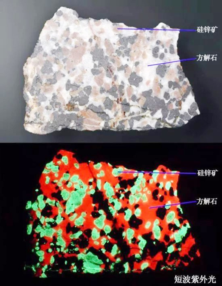 這是一種非常容易識(shí)別的含有熒光礦物的巖石,其中的兩種礦物會(huì)在短波紫外光下發(fā)出強(qiáng)烈的熒光:方解石(Calcite)發(fā)出紅色熒光,硅鋅礦(Willemite)發(fā)出綠色熒光。紅綠對(duì)比強(qiáng)烈,再加上沒有熒光的黑色鋅鐵礦(NFFranklinite),非常具有觀賞性。通常這種巖石被稱為“圣誕方解石(Christmas Calcite)”或者“瘋狂方解石(CrazyCalcite)”。