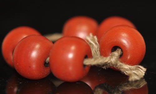 其次是質(zhì)感。南紅是膠質(zhì)感的,就算全紅的珠子也不是不透光的。即便是無(wú)色的南紅珠子,用肉眼觀察時(shí),也會(huì)有種朦朧的感覺(jué),類似和田玉般的油潤(rùn)感。