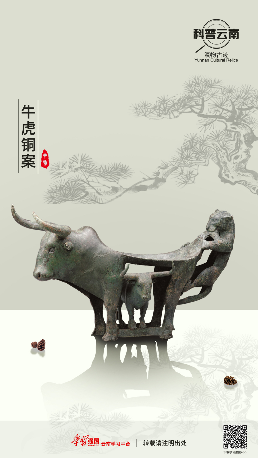 文物描述:此案由一虎二牛組成:主體為一立牛,巨角前伸,肩部隆起,四條腿作案足,牛背下凹呈盤狀作案面;牛后部攀爬狀一虎,躬身下垂,咬住牛尾,前爪緊扣案沿,后腿蹬于牛腿上;大牛腹下中空,一頭巨角前伸體量較小的牛橫向立于大牛前后腿間橫檔上。器物表現(xiàn)主題為滇國青銅器常見的“虎噬?!鳖}材,系分體鑄造后再鑄接而成。?;~案造型奇巧,動靜結合,比例協(xié)調,立意豐富,作為云南民族文化的標志性器物之一,既有中原地區(qū)四足案的特征,又具有濃郁的地方特點和民族風格,堪稱中國青銅藝術品之杰作。