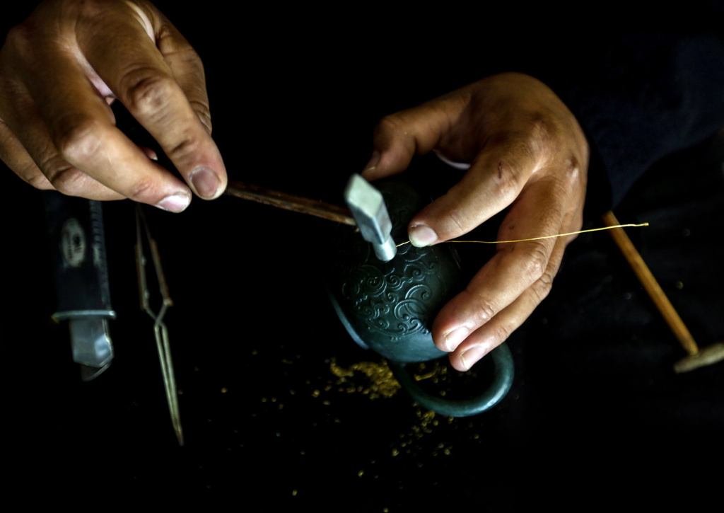8月19日上午,天空下著小雨,記者走進(jìn)位于河北衡水高新區(qū)大麻森鄉(xiāng)肖家屯村的“坤宸居”小院,感受傳統(tǒng)技藝的魅力?!昂芏嗳藢?duì)‘錯(cuò)金銀’比較陌生,但說(shuō)起金鑲玉就比較熟悉了?!蓖鯘d致勃勃地講起“錯(cuò)金銀”的前世今生:“凡是在金屬、玉器等器皿上繪制或雕制金銀圖案都被稱為‘錯(cuò)金銀’,這是中國(guó)古老復(fù)雜的裝飾工藝,最早見(jiàn)于商周時(shí)代的青銅器,漢代達(dá)到一個(gè)頂峰。由于制作過(guò)程需要精雕細(xì)鏨、繁復(fù)費(fèi)時(shí),時(shí)至今日,能夠掌握‘錯(cuò)金銀’工藝的師傅少之又少?!?/p>