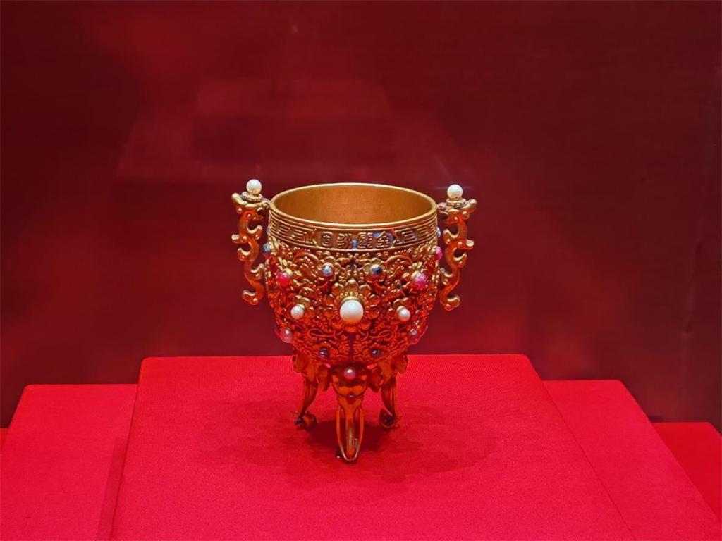 外壁滿鏨寶相花,花蕊以珍珠及紅、藍寶石為主。杯口沿鏨回紋一周,一面中部鏨刻“金甌永固”,一面鏨刻“乾隆年制”四字款。兩側有夔龍雙耳守護,龍頭上有珠。三只足皆為象首式,象耳略小,長牙卷鼻,額頂及雙目間亦嵌珠寶。金杯通體鏨刻的是纏枝寶相花紋,花紋間充盈著皇家點翠工藝,這就是現(xiàn)藏于北京故宮博物院的金嵌珠石金甌永固杯。