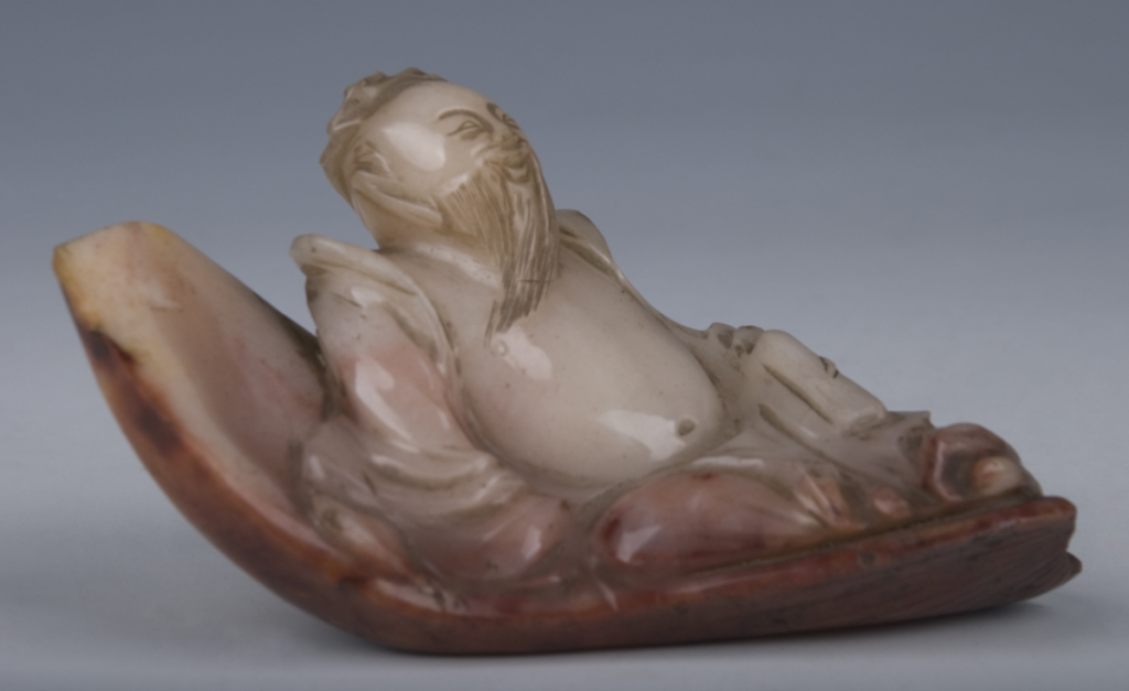 清乾隆瑪瑙人物,質(zhì)地為瑪瑙,保存完整,為瑪瑙巧雕。此雕刻為人物,雕一老漢,頭戴冠帽,面容慈祥,并帶微笑,長(zhǎng)須飄于胸前,袒胸大肚,外披衣衫,左手握一書(shū)卷,臥于一蕉葉形座椅上,悠然自得。蕉葉底部有十一道紋,人體部位白色,蕉葉部為紅色。整個(gè)作品雕刻精細(xì),技法嫻熟,人物栩栩如生,是一件品質(zhì)極高的精美藝術(shù)品,彰顯了中國(guó)工匠精神。此瑪瑙人物為清代的擺件,現(xiàn)存于山東汶上縣中都博物館,三級(jí)文物。