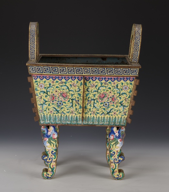 銅胎。平口,寬折沿,立耳,方腹,腹飾扉棱,平底,龍形足。外壁以黃色琺瑯釉為地,耳飾回紋、纏枝花卉紋;口沿飾回紋;腹飾如意云頭紋、纏枝花卉紋、蕉葉紋;足飾龍紋;篆書(shū)“太平御劉琦璋店建造”底款。