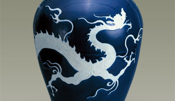 霽藍釉白龍紋梅瓶是元代瓷器制品的代表作,也是元代藍釉器中極為引人注目的藝術珍品。霽藍釉是化學元素鈷的呈色,最早見于唐三彩和唐白釉藍彩上,但這些都屬于低溫藍釉。元代,景德鎮(zhèn)的瓷工熟練地掌握了呈色劑制作方法,成功地燒制出了高溫藍釉。收藏于揚州博物館的這件霽藍釉白龍紋梅瓶就是景德鎮(zhèn)窯高溫藍釉的杰出作品。