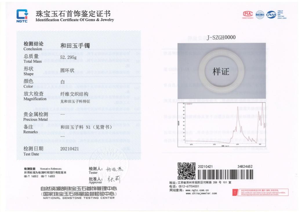 ▲珠寶國(guó)檢和田玉子料鑒定證書(shū)樣證