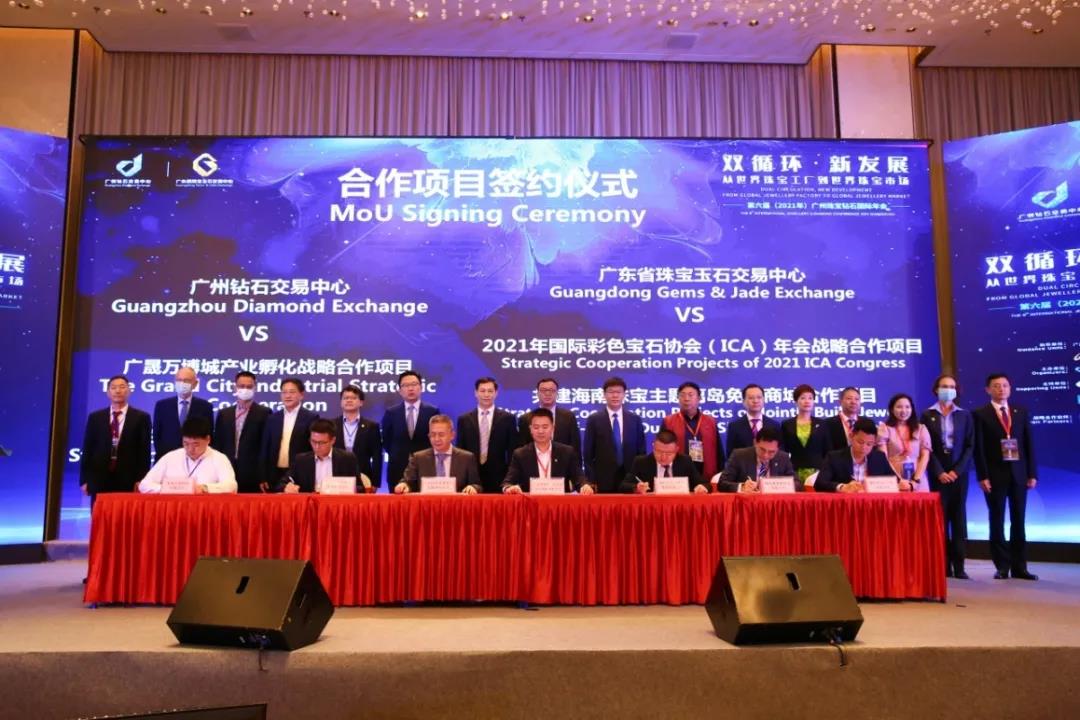 開幕式上,廣州鉆石交易中心(以下簡稱廣鉆中心)和 廣東省珠寶玉石交易中心(以下簡稱廣東寶交中心)分別就廣晟萬博城產(chǎn)業(yè)孵化戰(zhàn)略合作項(xiàng)目、易高生態(tài)科技有限公司戰(zhàn)略合作項(xiàng)目、2021年國際彩色寶石協(xié)會(huì)(ICA)年會(huì)戰(zhàn)略合作項(xiàng)目、共建海南珠寶主題離島免稅商城合作項(xiàng)目、彩色寶石原料競價(jià)交易會(huì)合作項(xiàng)目等與合作伙伴簽署競價(jià)交易合作協(xié)議,旨在匯聚行業(yè)內(nèi)外資源構(gòu)筑多元化、現(xiàn)代化鉆石珠寶行業(yè)服務(wù)樞紐。