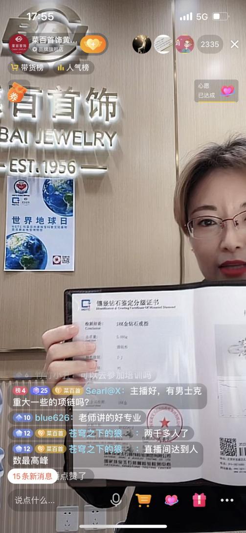 線上觀眾對此次直播報(bào)以積極回饋,1個多小時(shí)的直播時(shí)間,共吸引了超過1.3萬人在線觀看。當(dāng)珠寶國檢專家介紹實(shí)驗(yàn)室對鉆石的科學(xué)檢測方法、解讀鉆石鑒定及分級證書時(shí),兩個直播間同時(shí)在線人數(shù)瞬間突破3000人,點(diǎn)贊數(shù)超過6.6萬人次,位列抖音同時(shí)段、同類型直播排行榜前列,展現(xiàn)出消費(fèi)者對寶石礦物科普知識和消費(fèi)維權(quán)方法的極大熱情。