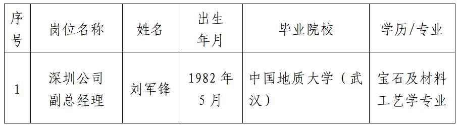 按照國家珠寶玉石首飾檢驗(yàn)集團(tuán)有限公司招聘工作方案要求,經(jīng)過發(fā)布招聘公告、資格審查、面試、體檢等程序,經(jīng)黨委會(huì)議研究,擬聘用劉軍鋒同志為深圳公司副總經(jīng)理,現(xiàn)予以公示。