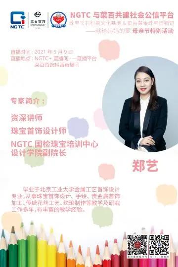 5月的第二個星期日是“母親節(jié)”,珠寶國檢(NGTC)與菜百首飾聯(lián)合策劃了一場有趣的珠寶科普手繪課——《繪“生”? 繪“色”》,為媽媽們獻上不一樣的節(jié)日禮物,屆時,NGTC國檢珠寶培訓中心首飾設計專家——鄭藝老師將帶領小朋友進行愛的涂鴉,用畫筆為媽媽設計、描繪母親節(jié)禮物!