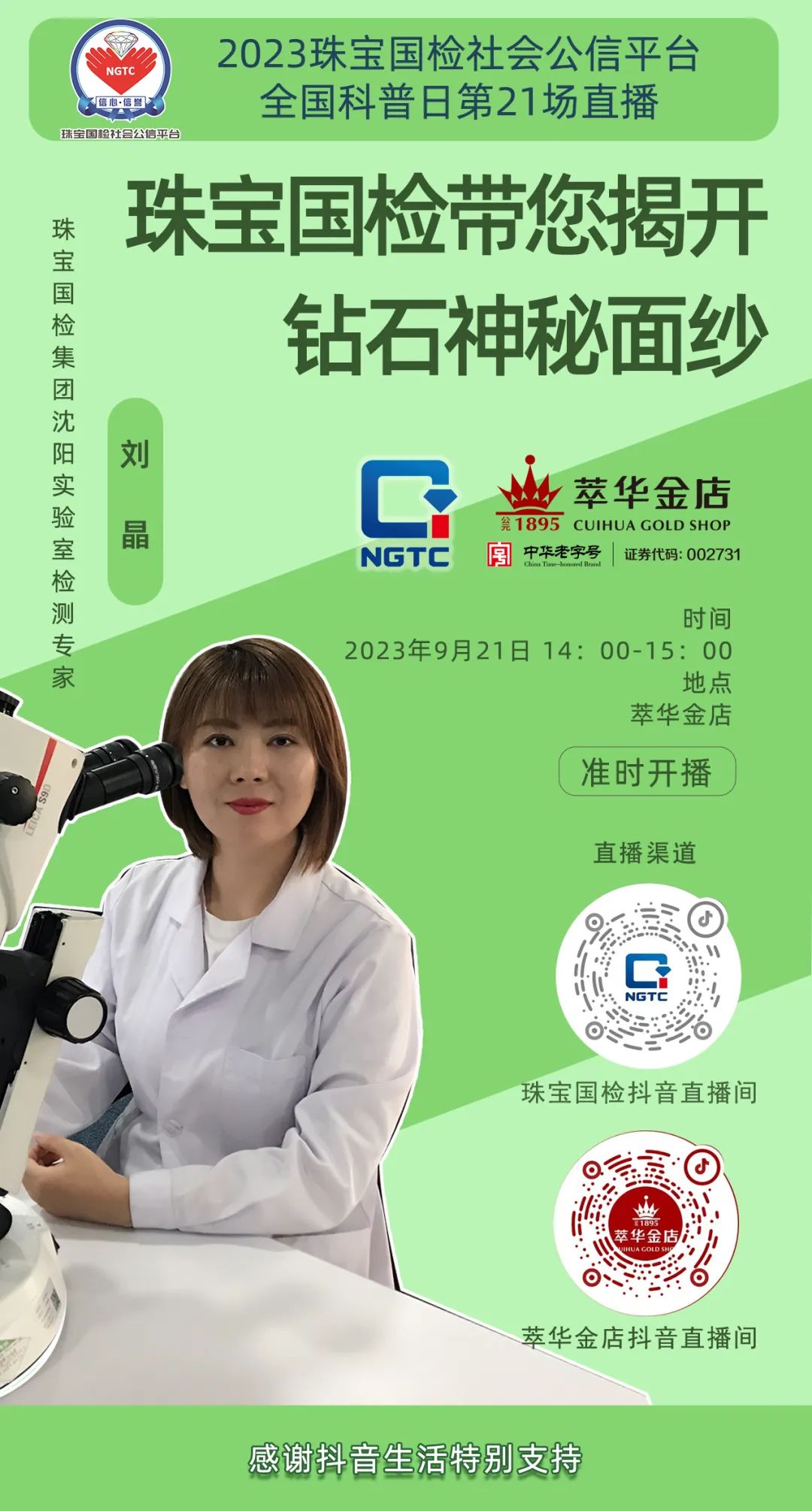 時(shí)間:9月21日14:00-15:00 地點(diǎn):萃華金店 出鏡專家:劉晶 直播間:萃華金店抖音直播間 珠寶國(guó)檢抖音直播間