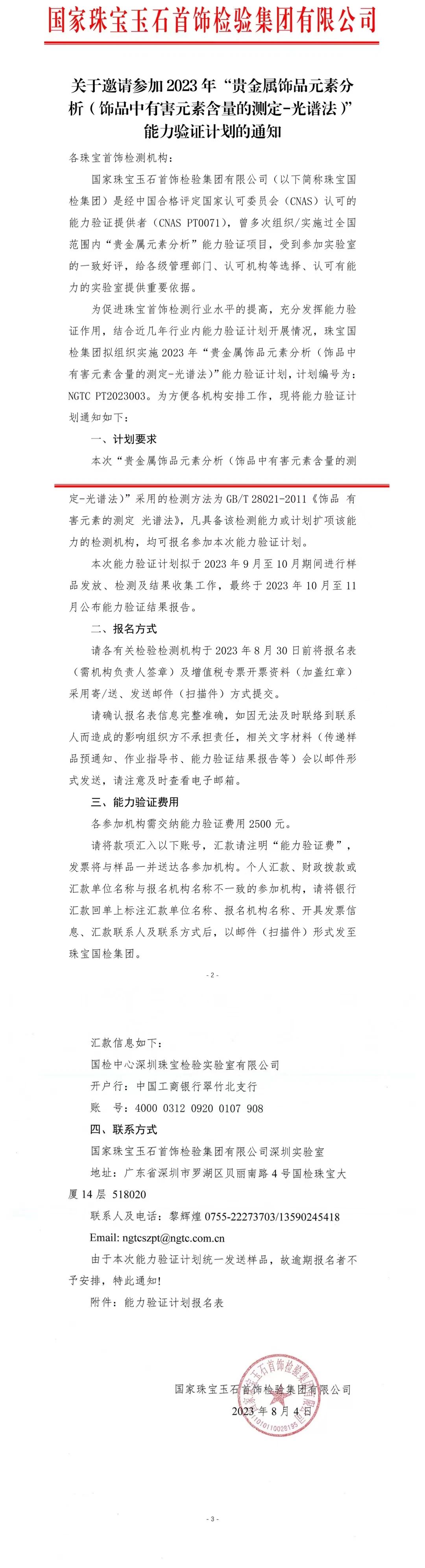 關(guān)于邀請參加2023年“貴金屬飾品元素分析(飾品中有害元素含量的測定-光譜法)”能力驗(yàn)證計(jì)劃的通知