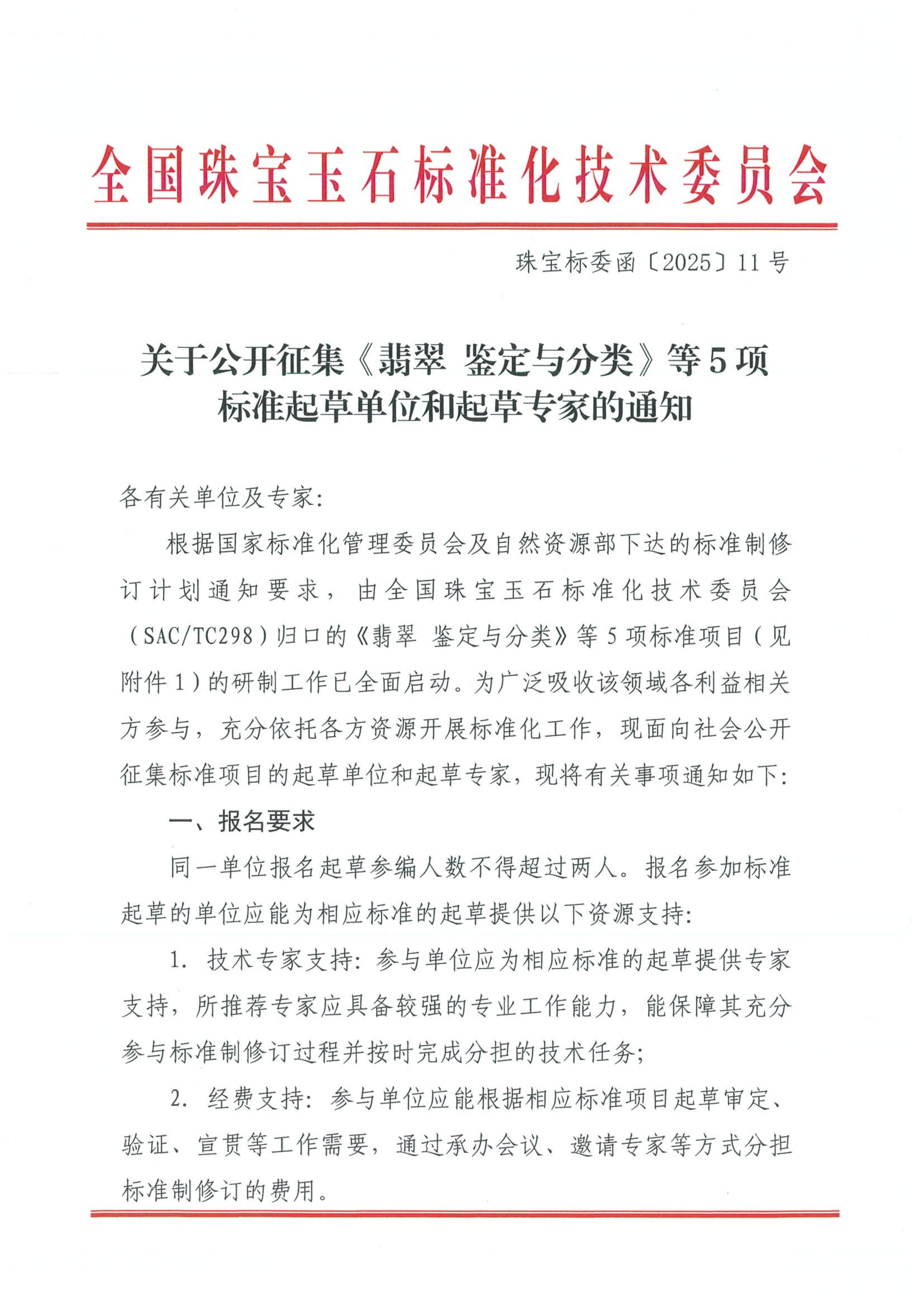 關(guān)于公開(kāi)征集《翡翠 鑒定與分類(lèi)》等5項(xiàng)標(biāo)準(zhǔn)起草單位和起草專(zhuān)家的通知
