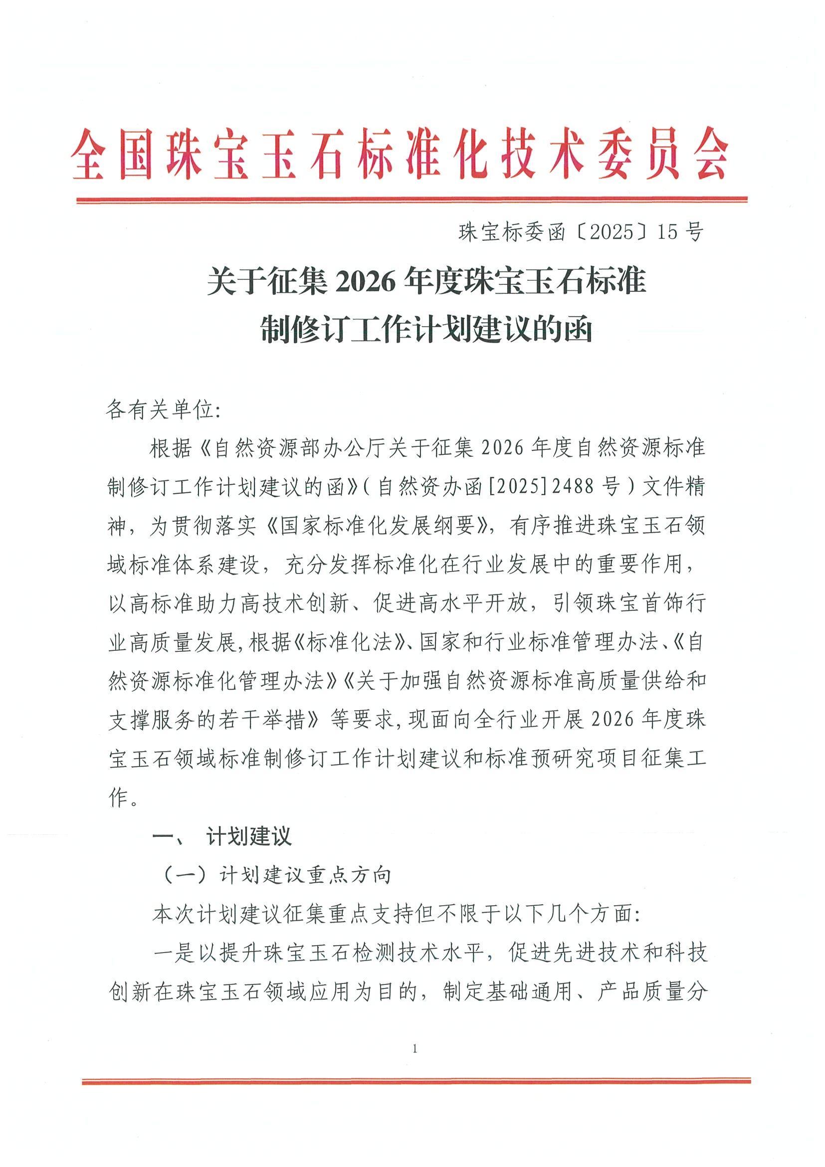 關于征集2026年度珠寶玉石標準制修訂工作計劃建議的函