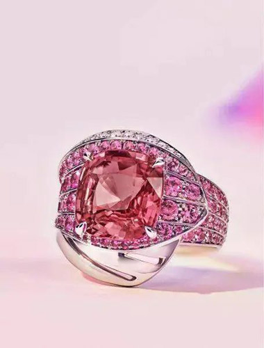 粉色藍(lán)寶石的色調(diào)比紅寶石色調(diào)淡雅一些,呈現(xiàn)的是一種嬌艷可人的鮮粉紅色。如何區(qū)別寶石是屬于紅寶石還是粉色藍(lán)寶石呢?鉻(Cr)元素的含量是決定這一問題的關(guān)鍵因素。寶石晶體結(jié)構(gòu)中的鉻(Cr)含量越多,寶石級剛玉的顏色就越紅。當(dāng)剛玉里面的鉻(Cr)元素含量低于0.9%或高于4%時,就不屬于紅寶石,而是屬于粉色藍(lán)寶石的范疇。然而,不同含量的鉻(Cr)元素會讓寶石的顏色濃度有所差異,這也會影響粉色藍(lán)寶石最終的呈現(xiàn)效果。品質(zhì)好的粉色藍(lán)寶石經(jīng)過完美切割后,在視覺上會與粉鉆的外觀接近。當(dāng)然,即便粉色藍(lán)寶石可以在一定程度上成為粉鉆的“平替”,但它的火彩與鉆石的璀璨火彩仍存在一定差距——粉色藍(lán)寶石給人的視覺感受更加柔和一些。