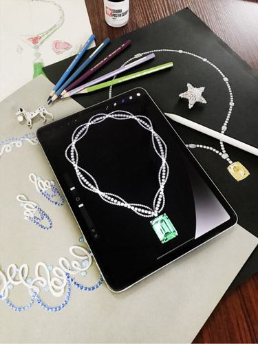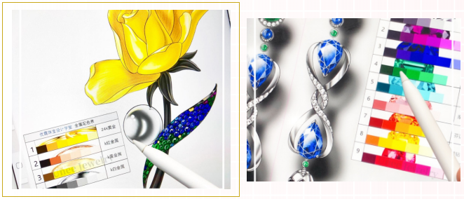如果說傳統(tǒng)一筆一劃的手繪更加適用于高級定制珠寶的設計展示,那么iPad(平板電腦)板繪就是一種高效便捷的方式,最大限度保證設計實用性和適配性,提高設計修改速度。