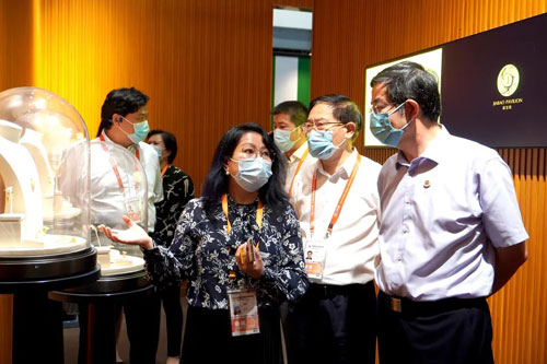消博會期間,中寶協(xié)會長,珠寶玉石首飾國檢集團(tuán)(以下簡稱:“珠寶國檢”)黨委書記、董事長葉志斌,中寶協(xié)副會長、秘書長畢立君率中寶協(xié)與珠寶國檢一行到嘉寶閣展廳參觀指導(dǎo)。