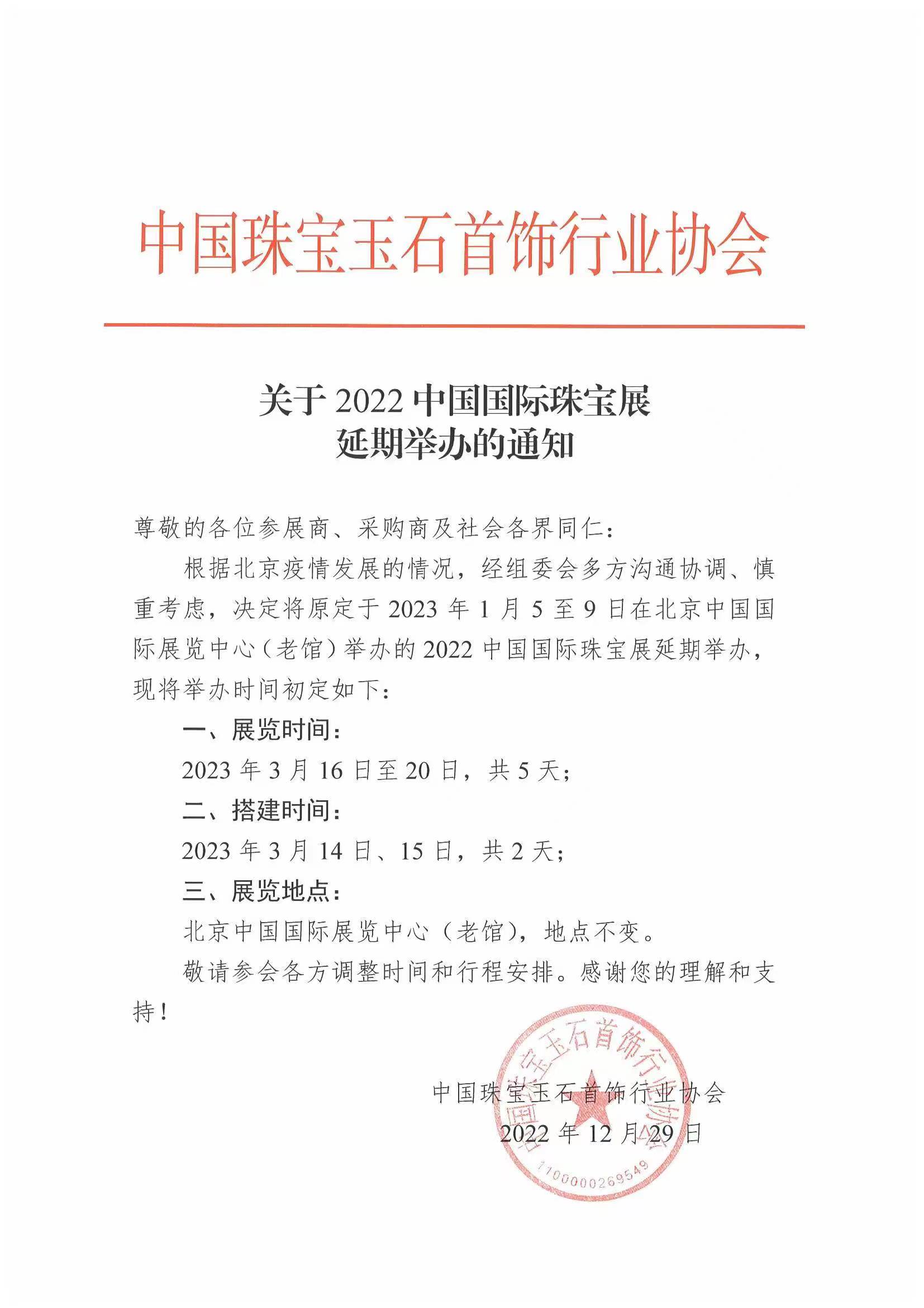 關(guān)于2022中國(guó)國(guó)際珠寶展延期舉辦的通知