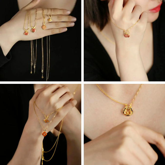 《兔年圖什么》是第六屆招金設(shè)計大賽“生肖設(shè)計大獎”的獲獎作品,由設(shè)計師陸靖婷設(shè)計。該系列產(chǎn)品將兔子與平安鎖、雙錢結(jié)、葫蘆等中國傳統(tǒng)文化元素相融合,并使用琺瑯配色,通過生肖兔與國潮文化的碰撞,傳達對美好生活的追求與向往。