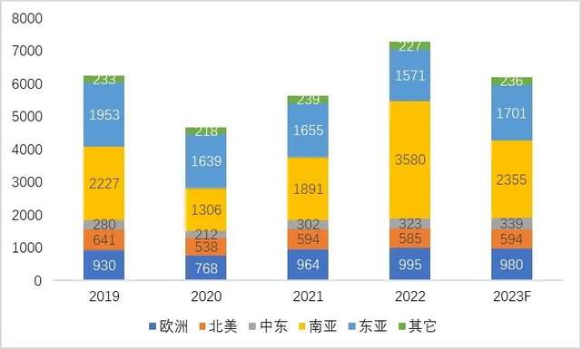 圖1 2019—2023年國際各區(qū)域銀飾用銀量(噸)