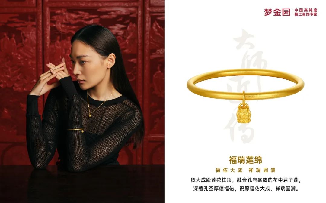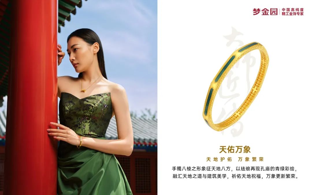 當日,夢金園黃金珠寶品牌代言人江疏影佩戴“大師匠傳”系列黃金飾品——“玲瓏慧心”項鏈、耳飾,搭配“天佑萬象”手鐲亮相,詮釋經典優(yōu)雅與現代時尚。據介紹,這套金飾設計靈感源自孔廟大成殿的八棱石柱,采用千年非遺技藝——花絲與點鉆工藝匠制,同時通過琺瑯工藝再現孔廟的青綠彩繪,既表達了對于歲月靜好的探尋,又祈佑萬象更新的繁榮。